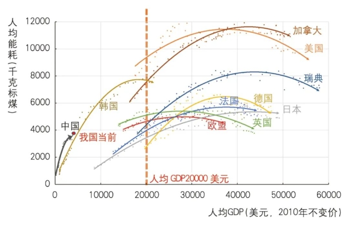 ▲ 图6 我国与世界主要经济体人均GDP增长与人均能耗的关系