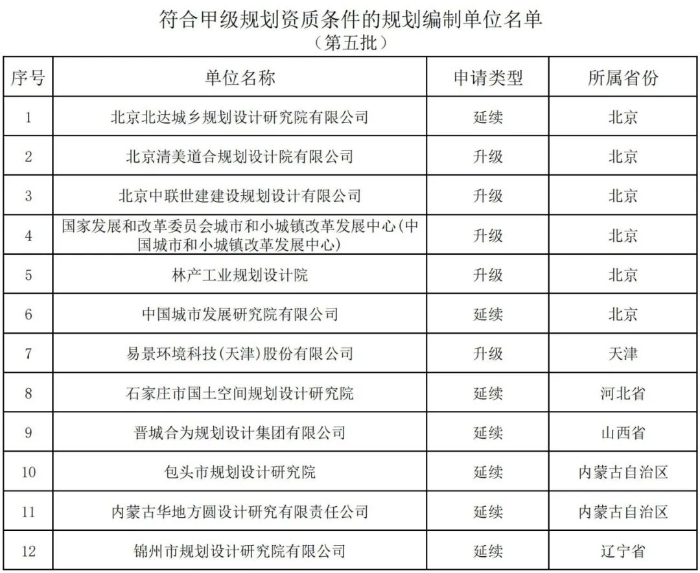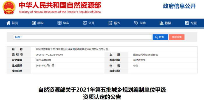 自然资源部关于2021年第五批城乡规划编制单位甲级资质认定的公告