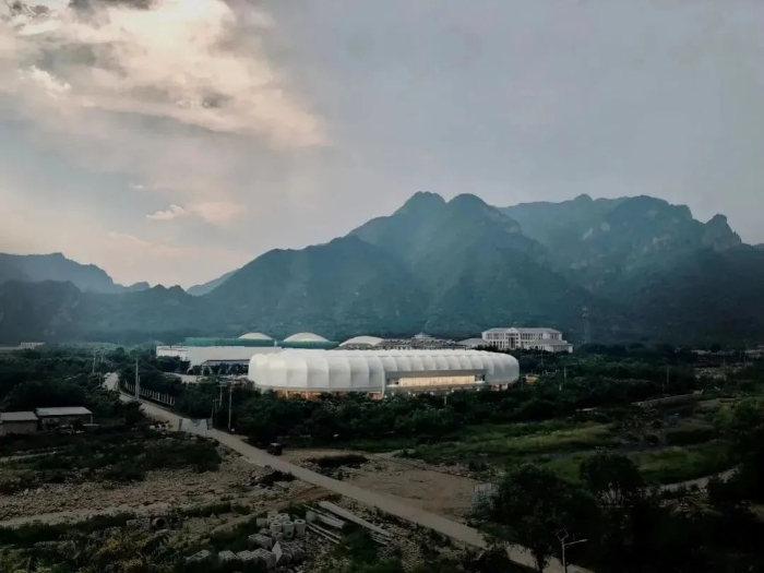 改造设计之初,设计团队发现,训练基地内现有的可建设场地很狭小,却需容纳尺度极大的标准速滑冰道、陆地训练跑道。如何化解“大块头”对狭小场地、景区风貌,以及建筑节能的压力,是速滑馆设计的难点。