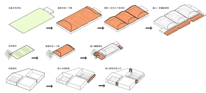 覆盖冰场的钢拱框膜屋面,圆润饱满,配合洁白光润的膜材,醒目地表达了冰上运动的纯净美好。设计将拱作为建筑整体上的词根,作出种种大小、位置不同的转译,形成了一套丰富的形式语言,赋予本次新建设施鲜明的代际识别性。