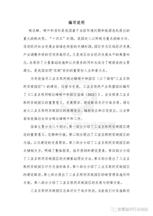 为有效指导工业互联网碳达峰碳中和园区(以下简称“工业互联 网双碳园区”)的建设、运营与发展,工业互联网产业联盟组织编写 了《工业互联网碳达峰碳中和园区指南(2021)》,旨在探索工业互 联网双碳园区的重要意义、发展需求、建设路径及评价体系等。通过 放大工业互联网双碳园区的规模效应、辐射效应和示范效应,以点带 面有效推动全社会碳达峰碳中和工作。