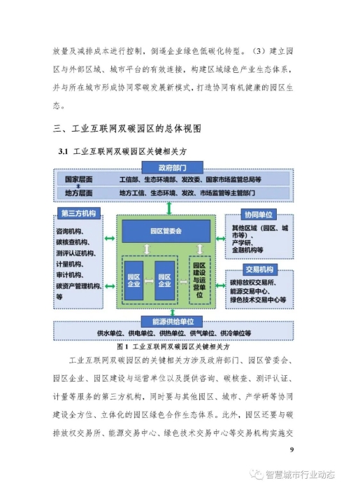 工业互联网双碳园区的关键相关方涉及政府部门、园区管委会、 园区企业、园区建设与运营单位以及提供咨询、碳核查、测评认证、 计量等服务的第三方机构,同时要与其他园区、城市、产学研等协同 建设全方位、立体化的园区绿色合作生态体系。此外,园区还要与碳 排放权交易所、能源交易中心、绿色技术交易中心等交易机构实施交易,利用市场化机制促进园区温室气体减排,并将能源供给单位接入 双碳园区建设管理体系,助力园区实现源头降碳,共同构建园区协同 零碳发展新模式。