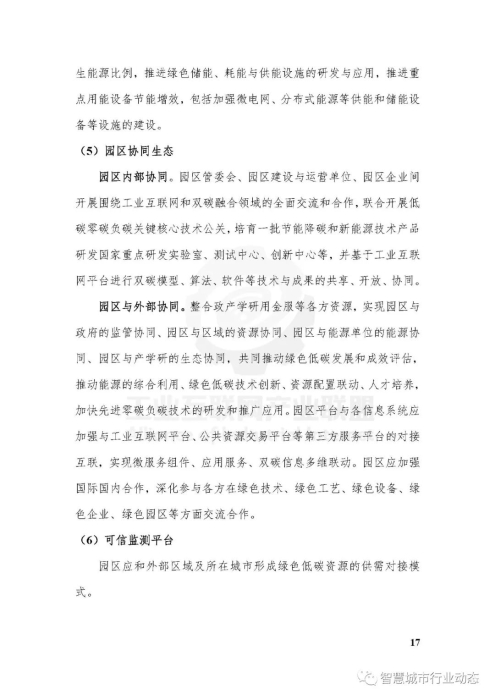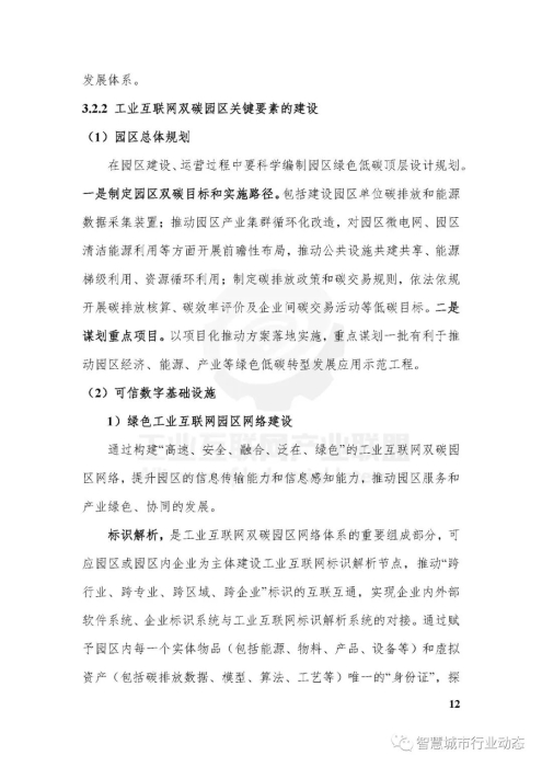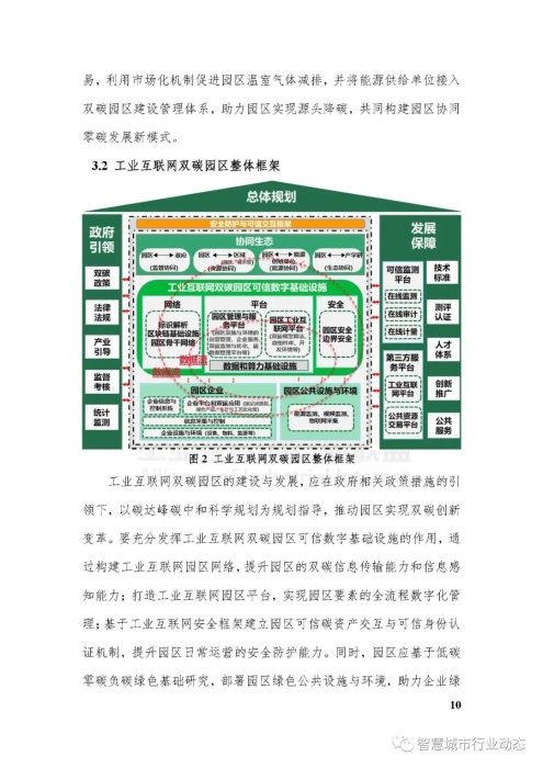 工业互联网双碳园区的建设与发展,应在政府相关政策措施的引 领下,以碳达峰碳中和科学规划为规划指导,推动园区实现双碳创新 变革。要充分发挥工业互联网双碳园区可信数字基础设施的作用,通 过构建工业互联网园区网络,提升园区的双碳信息传输能力和信息感 知能力;打造工业互联网园区平台,实现园区要素的全流程数字化管 理;基于工业互联网安全框架建立园区可信碳资产交互与可信身份认 证机制,提升园区日常运营的安全防护能力。同时,园区应基于低碳 零碳负碳绿色基础研究,部署园区绿色公共设施与环境,助力企业绿色化改造升级。进而通过持续优化升级,与外部政府、区域、能源供 给单位、产学研共同构建园区协同零碳生态模式,促进资源的充分整 合和共享。