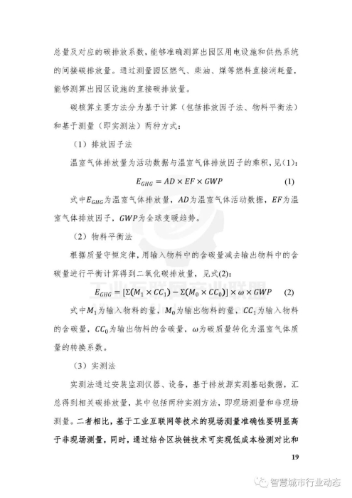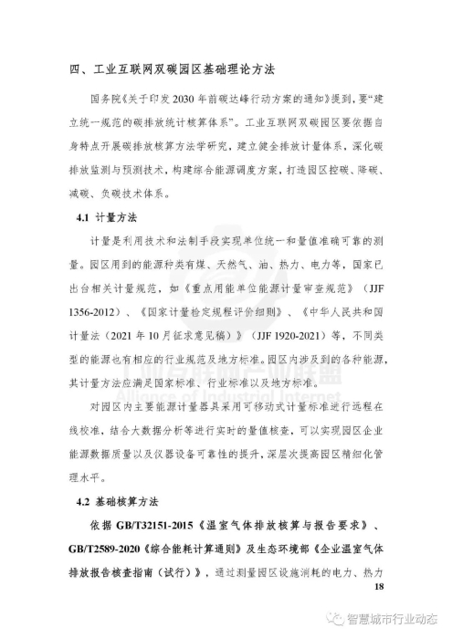 国务院《关于印发2030年前碳达峰行动方案的通知》提到,要“建 立统一规范的碳排放统计核算体系”。工业互联网双碳园区要依据自 身特点开展碳排放核算方法学研究,建立健全排放计量体系,深化碳 排放监测与预测技术,构建综合能源调度方案,打造园区控碳、降碳、 减碳、负碳技术体系。