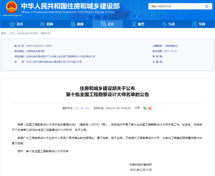 新年伊始,住房和城乡建设部于1月5日发布了《第十批全国工程勘察设计大师名单的公告》,授予于松伟等35名同志全国工程勘察设计大师称号。
