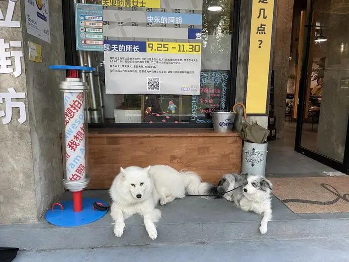 新华路上的酒吧前有了便民栓狗子柱,同时也举办社区展。