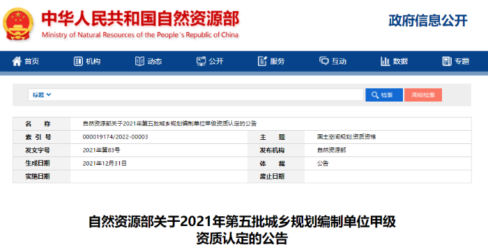 自然资源部关于2021年第五批城乡规划编制单位甲级资质认定的公告