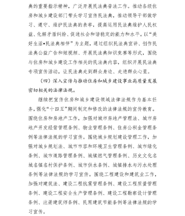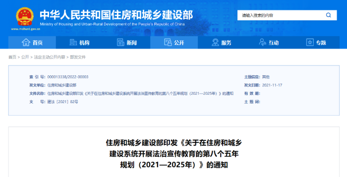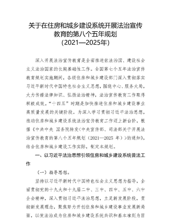 为深入学习贯彻习近平法治思想,推动住房和城乡建设系统法治宣传教育工作迈上新台阶,近日,住房和城乡建设部印发《关于在住房和城乡建设系统开展法治宣传教育的第八个五年规划(2021–2025年)》(以下简称《规划》)。《规划》分6个部分共计22项内容,全面阐述了工作任务和要求,为“十四五”时期高质量推进住房和城乡建设系统法治宣传教育明确了路线图和施工图。
