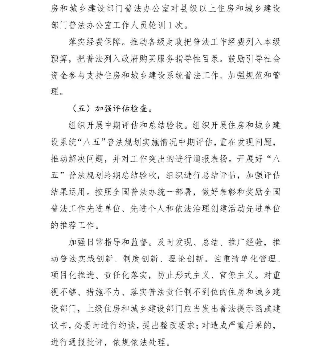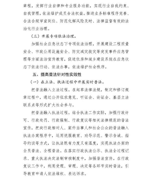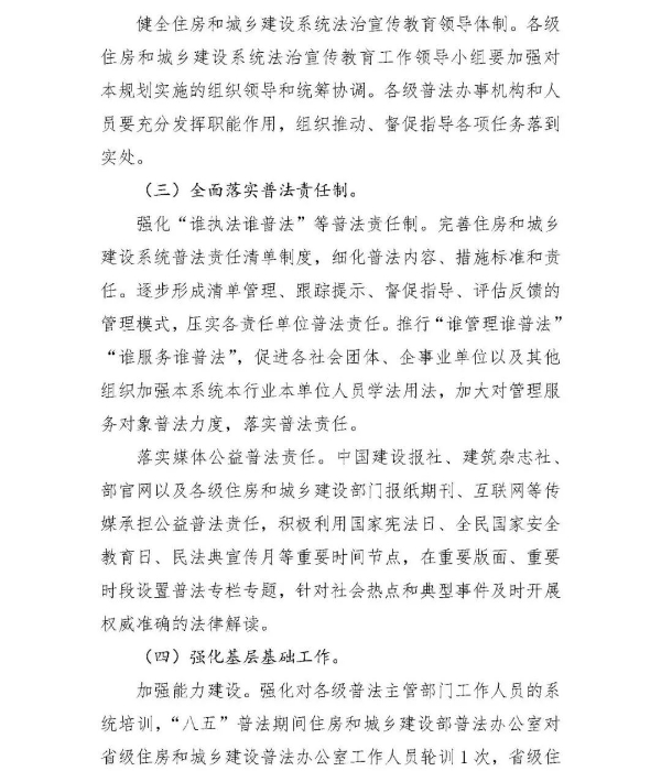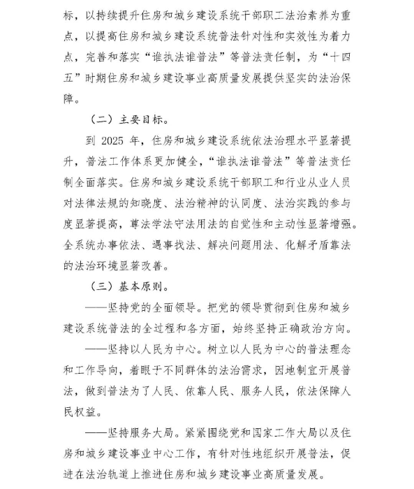 《规划》提出,到2025年,住房和城乡建设系统依法治理水平显著提升,普法工作体系更加健全,“谁执法谁普法”等普法责任制全面落实。住房和城乡建设系统干部职工和行业从业人员对法律法规的知晓度、法治精神的认同度、法治实践的参与度显著提高,尊法学法守法用法的自觉性和主动性显著增强。全系统办事依法、遇事找法、解决问题用法、化解矛盾靠法的法治环境显著改善。