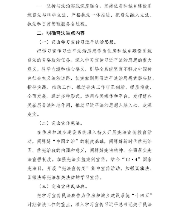 《规划》要求,明确普法重点内容。突出学习宣传习近平法治思想;突出宣传宪法;突出宣传民法典;深入宣传与推动住房和城乡建设事业高质量发展密切相关的法律法规;深入宣传党内法规。