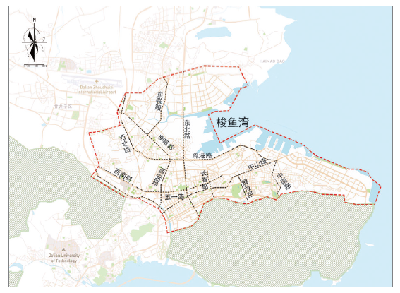 大连是一座典型的滨海海湾型特大城市,由于其沿湾发展的城市空间格局给城市带来了巨大的交通压力,根据《2020年中国主要城市交通分析报告》,大连位居全国城市拥堵排行榜的第8 位,其中大连交通拥堵排名前10 位的城市道路中有6 条位于老城区、中心区所在地梭鱼湾,交通拥堵严重。因此,本文以大连梭鱼湾交通拥堵地区为对象进行实证研究,范围为西起西北路—西南路,南至马栏河与南部风景区,北到东方路,东到大连湾海域的区域(图2)。
