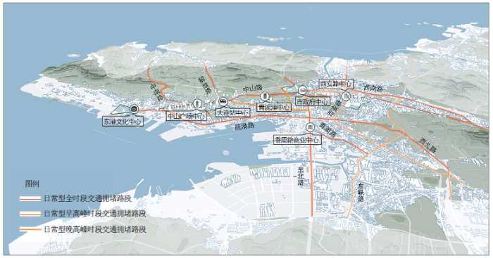 进一步分析梭鱼湾不同类型交通拥堵路段的特征可以发现:日常型全时段交通拥堵路段为进出梭鱼湾的跨湾出行道路及梭鱼湾内部连接市政府、CBD、火车站等中心区的主要道路,这是由于梭鱼湾内的城市功能服务区沿主要干道分布,且存在大量的通勤、旅游和消费等不同类型城市人群的出行需求,反映出梭鱼湾区域的城市中心功能过度集中,现有单一进出湾区的城市道路系统难以进行消解的城市问题。除日常型全时段交通拥堵路段外,日常型高峰时段交通拥堵路段在不同高峰期的情况也不同,在早高峰时期,梭鱼湾的出行人流主要集中于从甘井子、星海湾向湾内流动的西安路、五一路等路段,这在一定程度上反映出城市职住空间不匹配的问题;而在晚高峰时期,梭鱼湾的拥堵地区减少,主要以湾内出行为主,这可能是由于梭鱼湾内部功能的集中性,使得区域内的就业人群在晚上下班后直接在梭鱼湾内部进行其他游憩、消费行为,从而将进出湾区的出行量稀释到更多的时段。