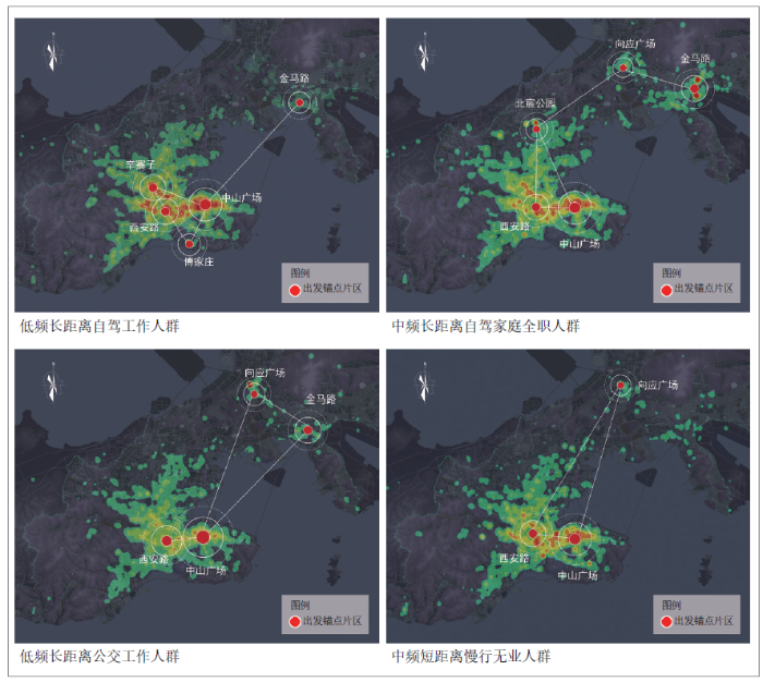 通过比较4 类典型人群在梭鱼湾内部的活动锚点及主要出行廊道,可以发现区域内4 类典型人群的活动锚点呈现出不同数量、不同类型的分布差异,出行廊道呈现单一廊道集聚的特征。4 类典型人群中,低频长距离自驾工作人群、低频长距离公交工作人群的活动锚点呈现点状连绵分布的特征,分布于中山路—西安路—西南路—西北路这一东西向主要交通廊道及疏港路沿线,形成了港湾广场、中山广场、友谊广场、青泥洼桥、西安路、马栏广场和虹港路等多个主要锚点,以及香炉礁、一二九街等多个次级锚点;中频长距离自驾家庭全职人群的活动锚点呈现多点多片的分布特征,主要在中山广场、人民广场、西安路和虹港路形成4 个活动锚点片区;中频短距离慢行无业人群的活动锚点则呈现多极点分布的特征,形成中山广场、青泥洼桥、西安路和虹港路4个以开放式公园、公共设施为主的活动锚点。4 类典型人群的出行廊道均集聚在中山路、疏港路、西北路和西南路等单向城市交通廊道,其中低频长距离自驾工作人群、低频长距离公交工作人群、中频长距离自驾家庭全职人群的出行廊道呈现单廊集聚、多路分散的特征,西安路、东联路、长春路、东联路和解放路等多条次级出行廊道连接在主廊道上,与活动锚点沟通;中频短距离慢行无业人群的出行廊道呈现集聚在单一廊道上的特征,借由中山路、疏港路、西北路和西南路等主廊道与主要的活动锚点沟通( 图6)。