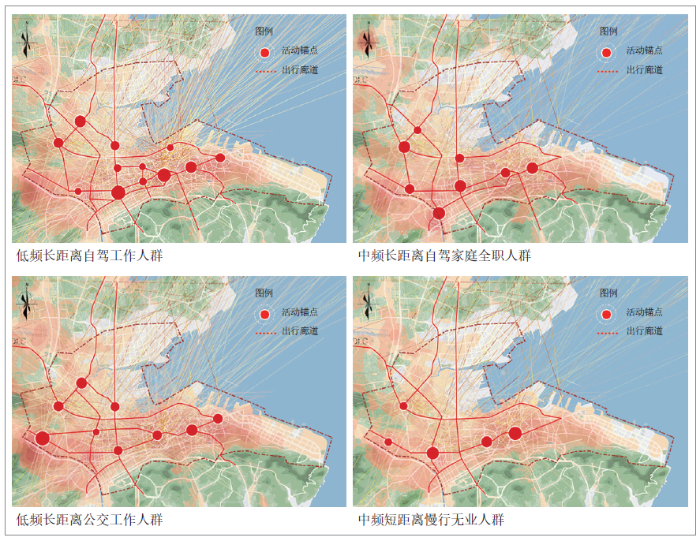 图6 4 类典型人群的活动锚点及出行廊道分析图