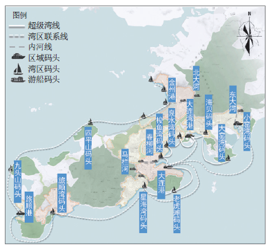 为满足以公交、慢行为主的低频长距离公交工作人群、中频短距离慢行无业人群的出行需求,未来应加强对多种交通方式的优化整合,因地制宜地运用多元化的公共交通组织形式,如地铁、轻轨、有轨电车和空中缆车等实现海陆联运,采用物联网、智能化管理系统,建立高效、便捷、畅通的转运平台,建立海陆立体交通体系,优化海陆接驳换乘游线,促进海陆一体化综合开发,促使梭鱼湾由大连城市末梢向尖端转变。为提高公交出行效率,打造3 条水上轮渡线,建立轮渡—公交—地铁10 分钟换乘圈。具体包括:将码头选址在湾区内重要的交通集散点上,以游艇、大型邮轮、帆船为主要交通工具,构建涵盖区域出行及游览的水上轮渡体系(图9);通过港口腹地用地复合化,在港口500m范围内配套轨道站点、公交站点、自行车驿站等多样换乘设施,实现3分钟步行圈覆盖自行车点、5分钟步行圈覆盖公交站点、10分钟步行圈覆盖地铁站点。