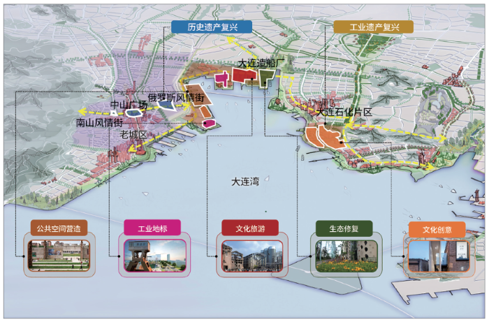 为缓解梭鱼湾内中频长距离自驾家庭全职人群、中频短距离慢行无业人群的游憩及消费地人流过载压力,应充分利用存量资源,以重点地区的城市更新提升梭鱼湾内部的中心功能丰富性、资源独特性与吸引力,形成更多元的活动锚点空间布局,改善单一廊道的出行。对于中山广场、南山风情街和俄罗斯风情街,应在原有基础上对周边区域进行风貌和高度管控,延续“欧亚海韵”的城市风貌特色。同时,通过文化路径串联,构建遗产保护整体格局。对于大连造船厂和大连石化片区,应在原有基础上对工业遗产进行整体保护,发掘内生的文化品牌,融入生态修复和城市织补的概念,充分利用存量建筑和空间资源,提升空间品质,构建沿梭鱼湾的文化休闲游憩格局;梳理大连造船厂的公共空间网络,结合工业文化主题设计品质化的广场公园,提高遗产所在空间环境的公共性、可达性;充分利用原有标志性构筑物,同时结合造船文化及工业风貌设计主题文化博物馆地标;强化大连造船厂的工业文化符号;对于原有遗产场地内污染严重、环境质量差的用地,应置入生态绿地并设计工业主题公园;合理评价大连石化片区的建筑质量、年代等,在此基础上进行更新改造,将其作为文化创意功能的载体,营造良好的创意园区空间氛围(图11)。