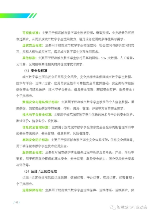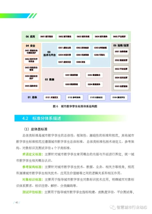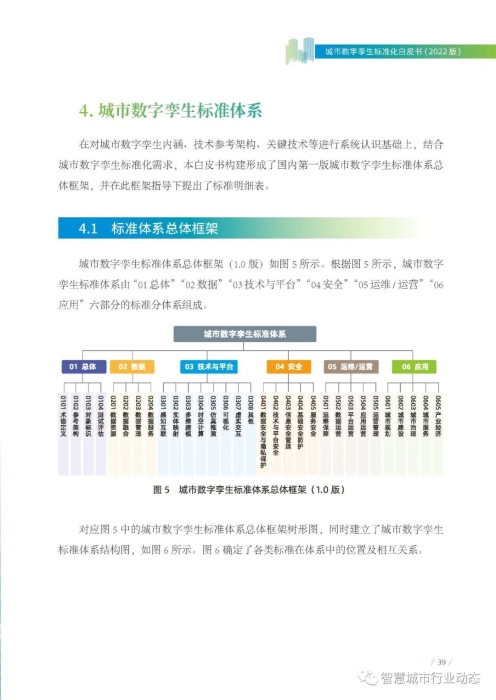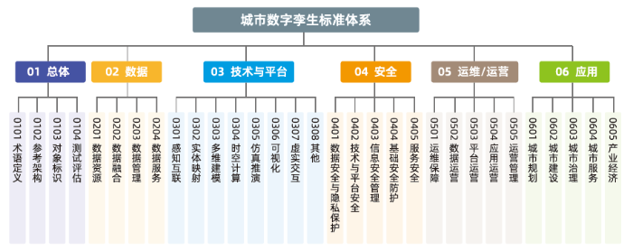 8、标准体系总体框架。城市数字孪生标准体系总体框架(1.0 版)如图5 所示。根据图5 所示,城市数字孪生标准体系由“01 总体”“02 数据”“03 技术与平台”“04 安全”“05 运维/ 运营”“06应用”六部分的标准分体系组成。