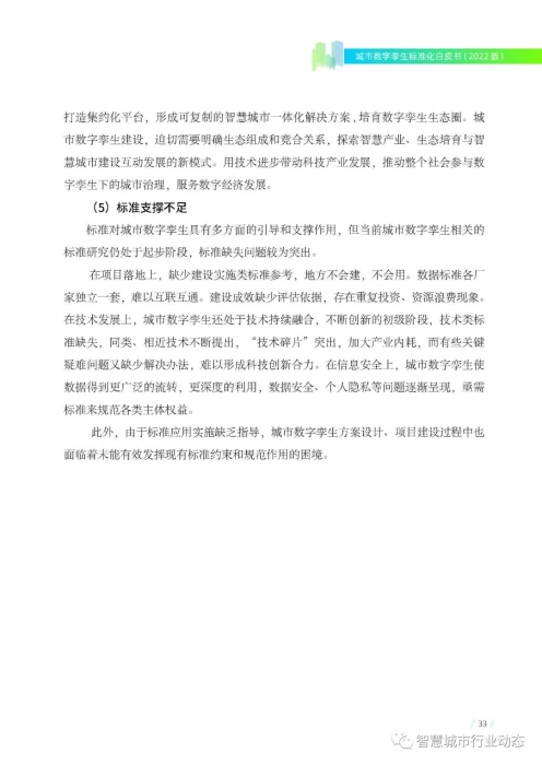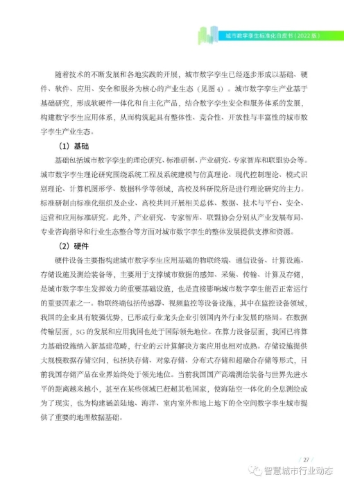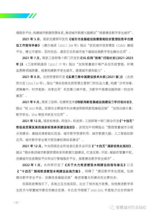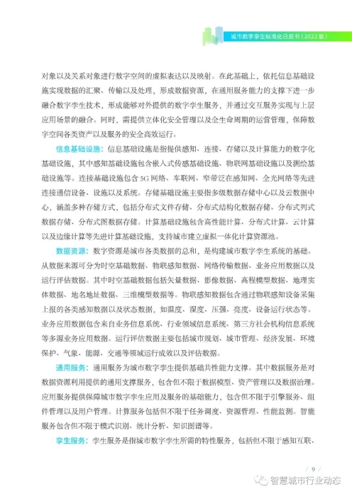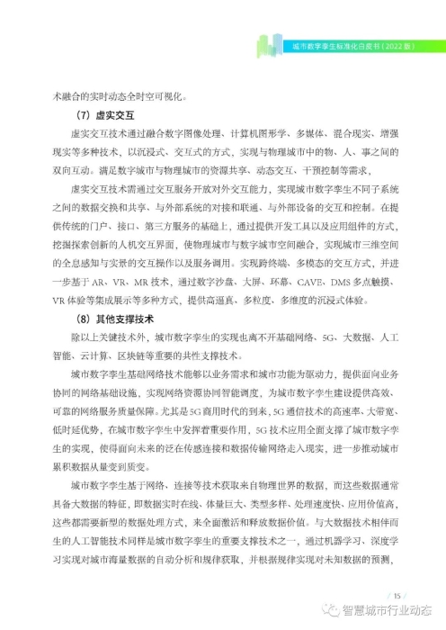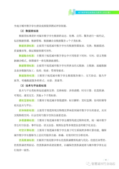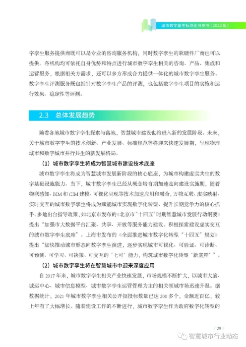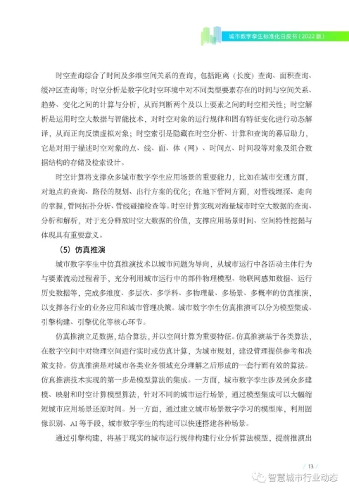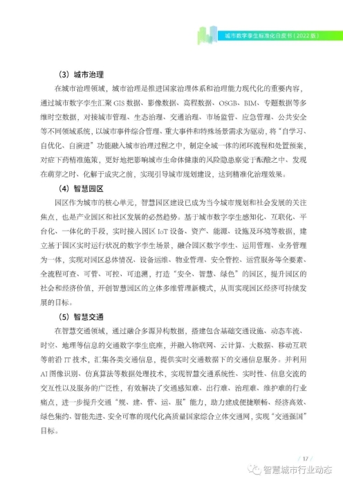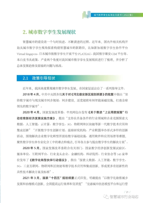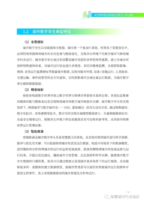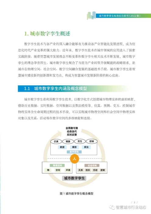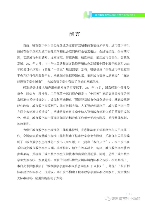 当前,城市数字孪生已经发展成为支撑智慧城市的重要技术手段。城市数字孪生 通过在数字空间对城市物理空间和社会空间进行全要素表达、全过程呈现、全周期可 溯,实现城市全面感知、虚实交互、智能决策、精准控制,推动城市智能化、智慧化 发展……为做好城市数字孪生标准化工作整体规划,有序推动相关标准制定与应用实施工 作,全国信标委智慧城市标准工作组组建了城市数字孪生专题组,并联合相关单位编 制了《城市数字孪生标准化白皮书(2022版)》。