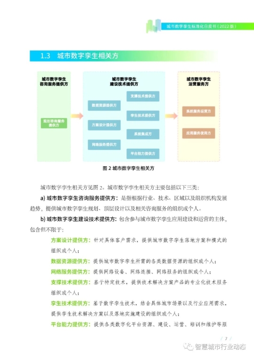 4、城市数字孪生相关方。涉及城市数字孪生咨询服务提供方、城市数字孪生建设技术提供方、城市数字孪生运营服务方。