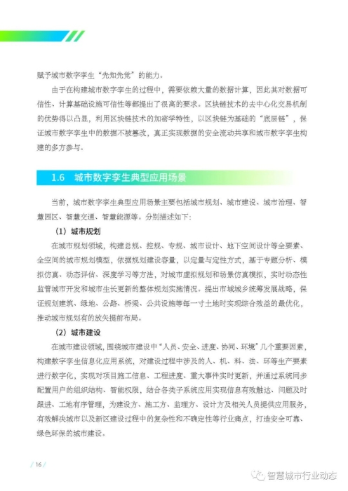 7、典型应用场景。城市数字孪生典型应用场景主要包括城市规划、城市建设、城市治理、智慧园区、智慧交通、智慧能源等。