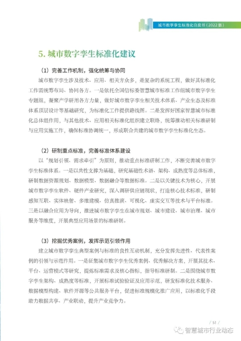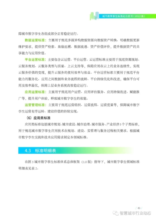 3、 本白皮书探索形成了“城市数字孪生标准体系总体框架(1.0版)”,并提出了拟研制 标准建议和标准化工作建议。本白皮书构建了城市数字孪生标准化路线图,为后续相 关标准研制、应用实施指明了方向。
