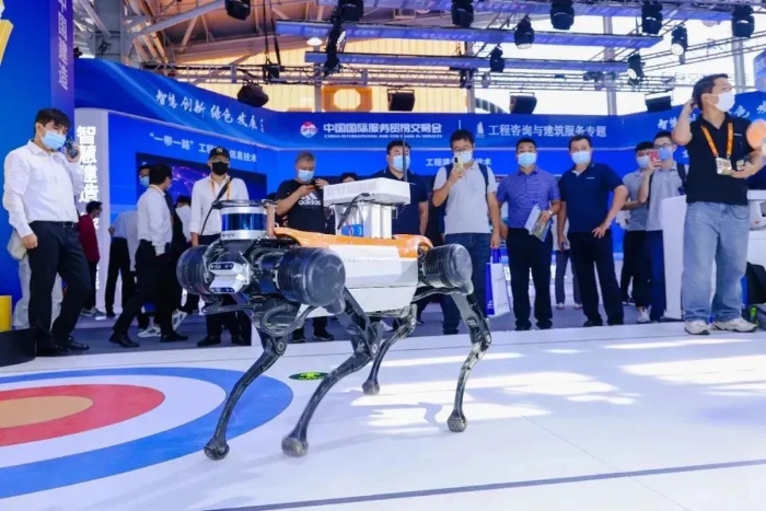 在数字化和智能化的发展趋势下,科技正与建筑领域深度融合。2021年服贸会上,一台正在行进、外形酷似猎狗的“机器人”吸引不少观众驻足围观。“这是研发的智能巡检机器狗,它跑得快、身手灵活、‘眼力’毒辣,可以代替人力深入到消防水井、地下管廊或较窄的肥槽等复杂危险区域,执行密闭施工空间环境的监测。”中建一局展区工作人员介绍,智能巡检机器狗身上“背”着有害气体监测仪,可自动识别一氧化碳、可挥发有机物、粉尘等,实时显示和上传监测数据、生成对应趋势曲线,不仅减少安全事故发生率,而且极大节省成本。