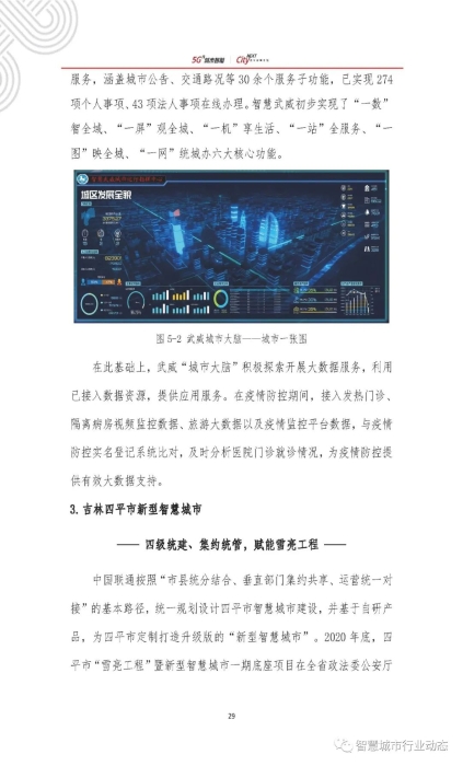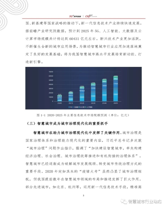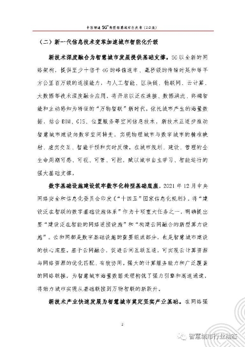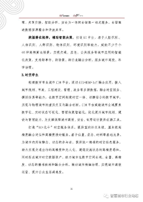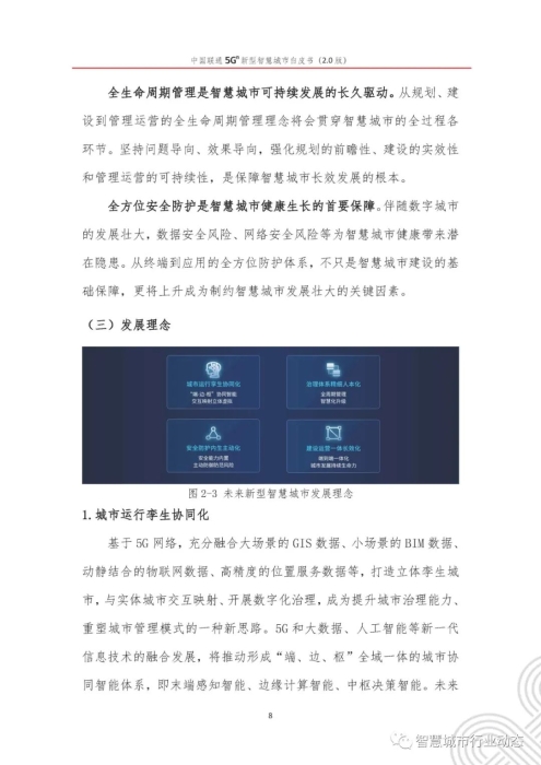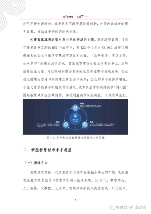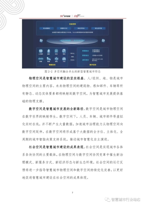 5G、数字孪生、大数据、云计算、人工智能、区块链等新一代信息技术正在迅速发展,为智慧城市建设提供有力支撑。未来新型智慧城市将以信息技术为驱动力、以人本需求为出发点、以融合共生为导向,逐步推动物理空间、数字空间、社会空间“三空间”和全生命周期管理、全方位安全防护“两全面”的深度融合,最终实现城市精细化管理、智能化服务、特色化发展。