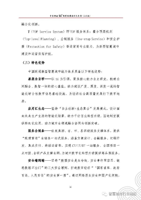 T即TOP服务体系:整合顶层规划(Top-level Planning)、全链服务(One-stop Service)和安全护盾(Protection for Safety)等运营商专业能力,为新型智慧城市建设和运营保驾护航。