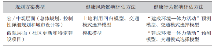 表1 针对不同规划方案类型的健康风险和健康行为影响评估方法