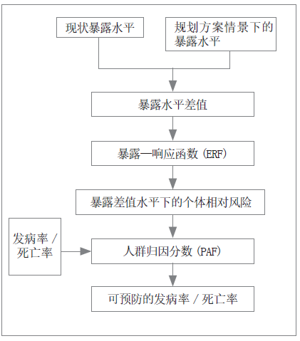 主要评估过程为:①确定风险/ 行为—结果对(Risk/Behavior-Outcome Pairs),如“空气污染—全因死亡率”;②确定现状与规划方案情景下的暴露水平差值,如与现状相比,规划方案年平均PM2.5 浓度降低20 ug/m³;③确定暴露—响应函数,即一定单位的健康风险/行为变化导致的健康结果变化相对风险(Relative Risk,RR);④计算暴露差值水平下的个体相对风险,可根据当前暴露差值,用暴露—响应函数转换得到;⑤计算人群归因分数(Population Attributable Fraction,PAF),即人群中特定健康结果可归因于健康风险/ 行为变化的比例,是相对于暴露建议值水平,当前暴露差值水平增加的健康影响占比;⑥根据本地健康结果数据,计算规划方案可降低的疾病负担,即健康风险/ 行为变化带来的人群健康结果变化(图2)。