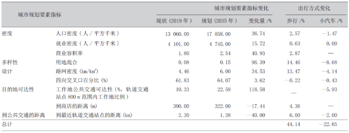 表2 案例地区城市规划要素指标和出行方式变化比例