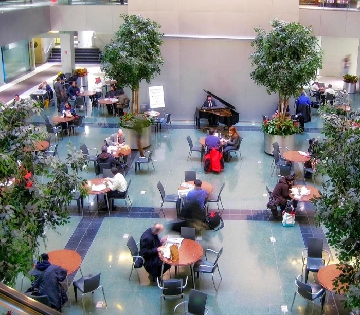 大厦内部有6个入口,其中3个可直达建筑外围的街道,人们可以穿越中庭到达城市其它空间。大厦的中庭配置了56张桌子和144个座位,廊道周边则设置各类便民性的商业功能,使建筑室内空间公共化。