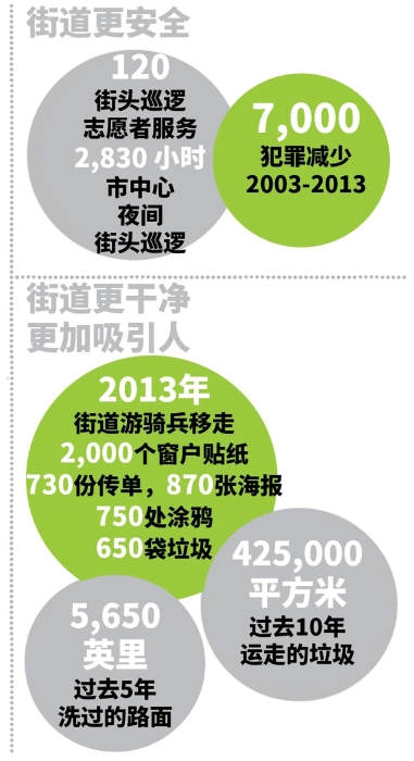 此外,商业促进区内以联合巡逻队形式,提升街区的治安环境;通过从政府到企业的宣传推广组合,提升民众对街区环境的共同维护。▼ BID模式对街道的部分作用