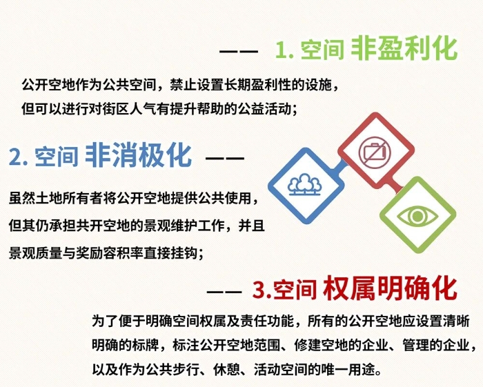 「公开空地」是指大型开发项目内的公共开放空间,这些空间必须具备空间非盈利化、空间非消极化、空间权属明确化的三大特点。