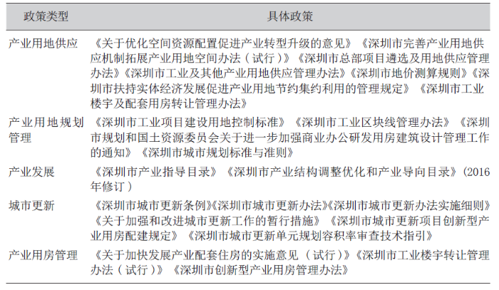 深圳工业用地高质量利用和管理的实现也与其完善的政策环境息息相关。深圳在产业用地供应、产业用地规划管理、产业发展、城市更新和产业用房管理等方面出台了一系列政策,构建了较为完善的政策体系( 表1)。