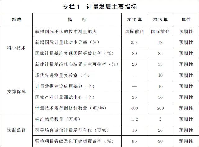 (三)发展目标。到2025年,国家现代先进测量体系初步建立,计量科技创新力、影响力进入世界前列,部分领域达到国际领先水平。计量在经济社会各领域的地位和作用日益凸显,协同推进计量工作的体制机制进一步完善。