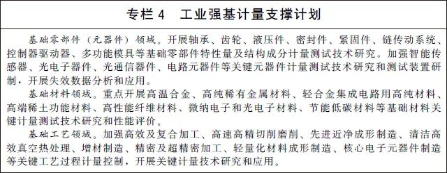 (九)支撑先进制造与质量提升。实施制造业计量能力提升工程,建立一批先进制造业发展急需的高准确度、高稳定性计量基准、标准。在战略性新兴产业和现代服务业等领域,建设一批国家产业计量测试中心和联盟,搭建计量公共服务平台,聚焦制造业领域测不了、测不全、测不准难题,加强关键计量测试技术、测量方法研究和装备研制,为产业发展提供全溯源链、全产业链、全寿命周期并具有前瞻性的计量测试服务。开展产业计量基础能力提升行动,实施工业强基计量支撑计划,充分发挥计量对基础零部件(元器件)、基础材料、基础工艺的技术支撑和保障作用。研究建立国家工业计量基础数据库,加强工业制造领域计量检定、校准、测试和检测数据的采集、管理和应用。