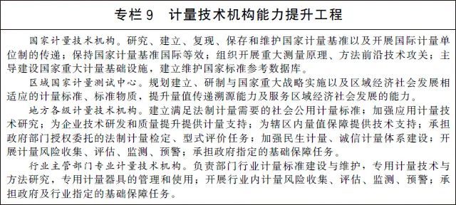 (二十一)加快计量技术机构建设。深化计量技术机构改革创新发展,优化整合国家计量技术机构、区域国家计量测试中心、地方各级计量技术机构和行业主管部门专业计量技术机构。大力推动国家计量技术机构创新发展,通过组织开展重大测量原理、方法前沿技术攻关,建立量子计量基准并保持国际等效,提供一流的量值溯源和测量服务,支撑国家科技创新、工业竞争力提升和经济社会发展。充分发挥省级人民政府和行业主管部门计量基础设施规划建设自主权,加强普惠性、基础性和公益性计量基础设施建设。提升计量技术机构服务市场的能力和水平,推动形成一批专业领域服务平台,培育一批专业化、社会化、网络化的服务机构,为经济社会发展和行业创新提供计量测试服务。