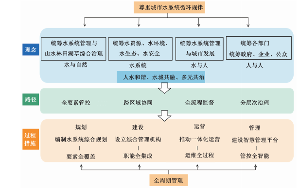 新时期,科学的城市水系统管理,应摒弃“条块分割”“碎片化”管理方式,贯彻“全周期管理”理念,坚持以人民为中心,坚持系统观念,运用发展、全面、系统思维,构建城市水系统全周期闭环管理政策体系,做好城市水系统顶层设计,突破条块分割式传统管理格局,创新一体化运营模式,在融合多源涉水信息基础上,依托智慧管理平台实施闭环管理,打造城市水系统全周期管理机制,为强化城市水系统整体效能、健全城市有机生命体、构建流域生命共同体提供支撑。