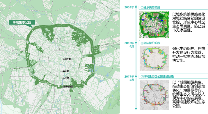 环城生态公园前身是2003年城市总规修编在中心城区外围划定的198平方公里“限建区” ,此后随着功能内涵的不断演进,其发展大致经历了三个阶段,体现了成都市对这一区域建设管控持续的深化认识和创新创造。
