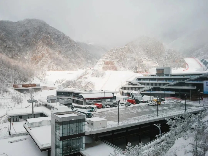 国家高山滑雪中心位于延庆小海坨山南麓中高海拔区域,各类雪道依山就势,按照竞赛组织要求成链式布置。建筑空间需要布置在出发区域、结束区域等雪道核心区域相对平缓的场地上,建筑空间形态受到自然山地环境的制约并形成相互依存的关系,设计始终面临着复杂山地条件下用地容量小与赛时场地规模及功能空间需求量大的矛盾。对应2018年平昌冬奥会由旌善高山滑雪中心(Jeongseon Alpine Centre)和龙坪高山滑雪中心(Yongpyong Alpine Centre)2个场馆分别承担高山滑雪的速度和技术项目比赛,2个场馆均设置集散广场,集散广场和结束区2块用地分散布置,集散广场用地主要通过填挖方的方式满足赛时用地需求,用地规模远大于延庆国家高山滑雪中心。
