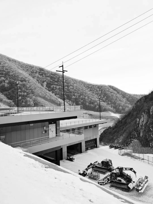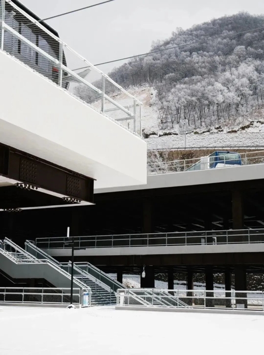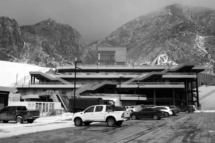 相对设施化的建筑语言反映了国家高山滑雪中心“低调而消隐”(Low-pitched and Hidden)的设计态度。对材料品类的筛选提炼也是对山地建筑完成度的控制策略;考虑山地运输及安装条件,预先做了小尺度的板块划分,板材多采用开缝处理,减少施工工序;山地环境类别和严寒气候分区要求设计对材料耐候性、耐久性、抗冻性、吸水率等相关技术参数严格控制;扶梯、电梯相应采取桁架内及井道内设置加热设备来应对高山环境可能出现的极寒天气;对停车及压雪车过车平台混凝土面层材料的抗盐冻性要求进行了专家论证,采用F50抗冻混凝土配筋面层切实可行的解决方案。