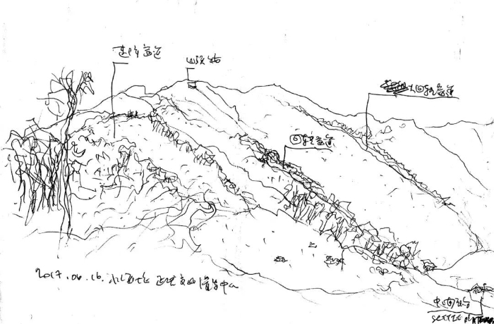 在两个结束区集中应用迭台形式之外,索道A,B线路各设置有中间站,A线路中站海拔标高1041m,是延庆冬奥村到集散广场之间转角站,B线路中站(即中间平台,同时也设有C线路下站,在此由B换乘C至山顶出发区)海拔高度1554m,是集散广场到竞技结束区的转角站。设计将中间站视作集散广场的“延伸”,形式选择上也将其整合到上述策略中去。