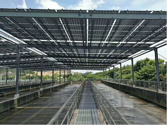 净高4.9m的生化池部分采用门式钢架结构安装光伏组件,节省大量钢材,同时对水厂生产作业完全不造成影响。