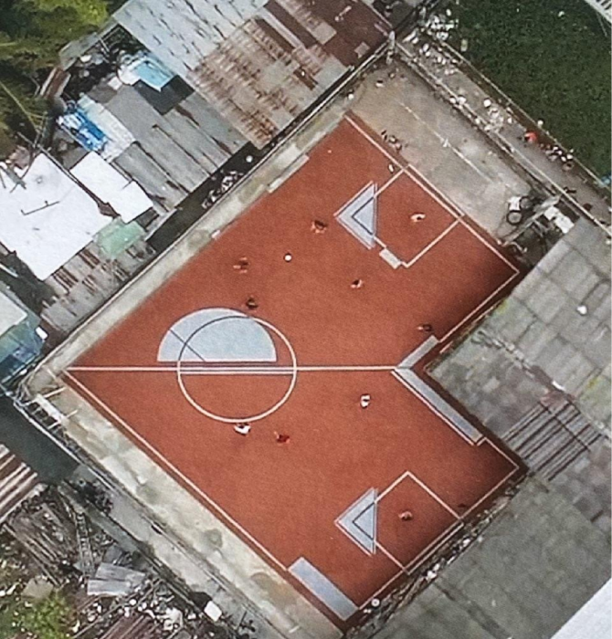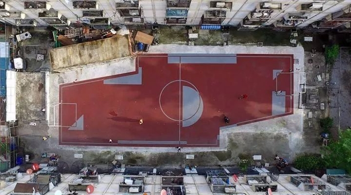 泰国曼谷的社区孔堤是一个贫民街区,这里的居民缺少体育运动的公共设施和空间。当地政府、地产企业和设计师曾经共同努力来解决这一问题,为孩子们提供一些踢足球的场地。由于在这种老旧街区很难找出标准化的足球场空间,设计师就通过一种富有创意的方式来实现这件事。