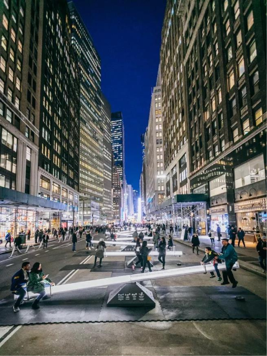 纽约街道的闲置空间内安装了一种公共游戏设施——跷跷板,吸引市民前来娱乐休闲。城市里的翘翘板游戏,促进了人与人之间的社会交往,增进了社区邻里的亲和力与凝聚力。