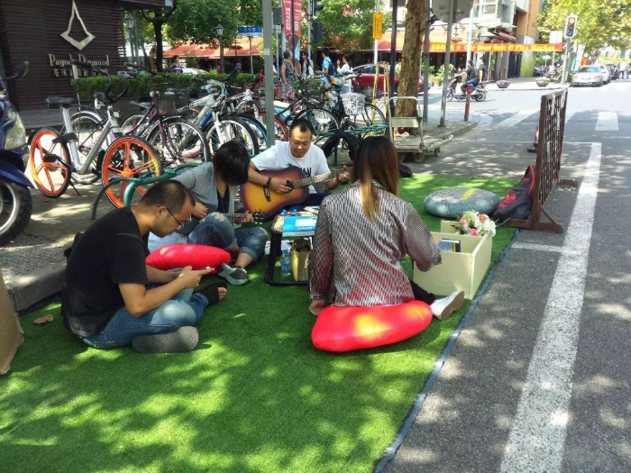 在美国很多城市,车行是主要的交通方式。但是在旧金山,人们恰恰反其道而行之,把一些停车位腾退出来,改造成快闪公园。在一个停车位的区域里,市民可以享受文化娱乐活动,比如弹弹吉他,听听音乐。