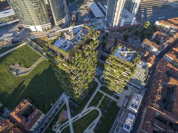 米兰的“垂直森林”是世界上第一个绿色建筑项目。在高达111米和80米的两座楼里,共种植着730棵乔木、5000株灌木和1.1万株草本植物,相当于1.1万平方米的绿色植被。建筑内部设计了一个浇灌系统,使用回收水来维持树木的生长;而且它还能够利用太阳能增加能源的自给。