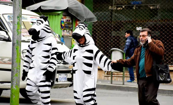 玻利维亚拉巴斯的“斑马人”项目是由市政府资助的公益项目。每年有几百名年轻人被组织起来,维持城市交通安全。