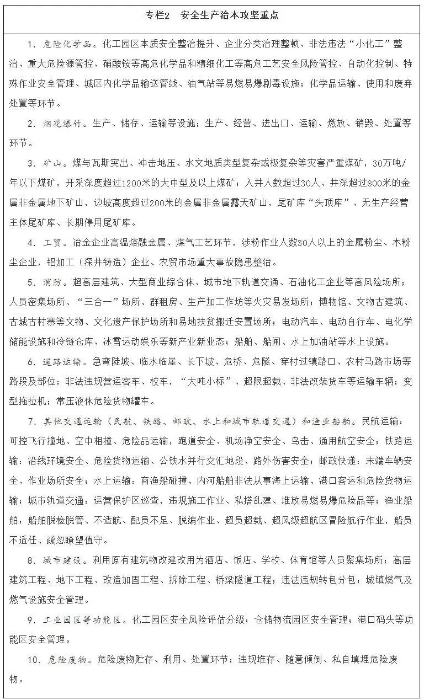 实施化工园区安全提质和危险化学品企业安全改造工程,以危险工艺本质安全提升与自动化改造、安全防护距离达标改造、危险源监测预警系统建设为重点,推进化工园区示范创建,建设化工园区风险评估与分级管控平台。推进城镇人口密集区危险化学品生产企业搬迁改造。开展煤矿瓦斯综合治理和水害、火灾、冲击地压等重大灾害治理。基本完成尾矿库“头顶库”安全治理及无生产经营主体尾矿库、长期停用尾矿库闭库治理。实施“工业互联网+安全生产”融合应用工程,建设行业分中心和数据支撑平台,建立安全生产数据目录。